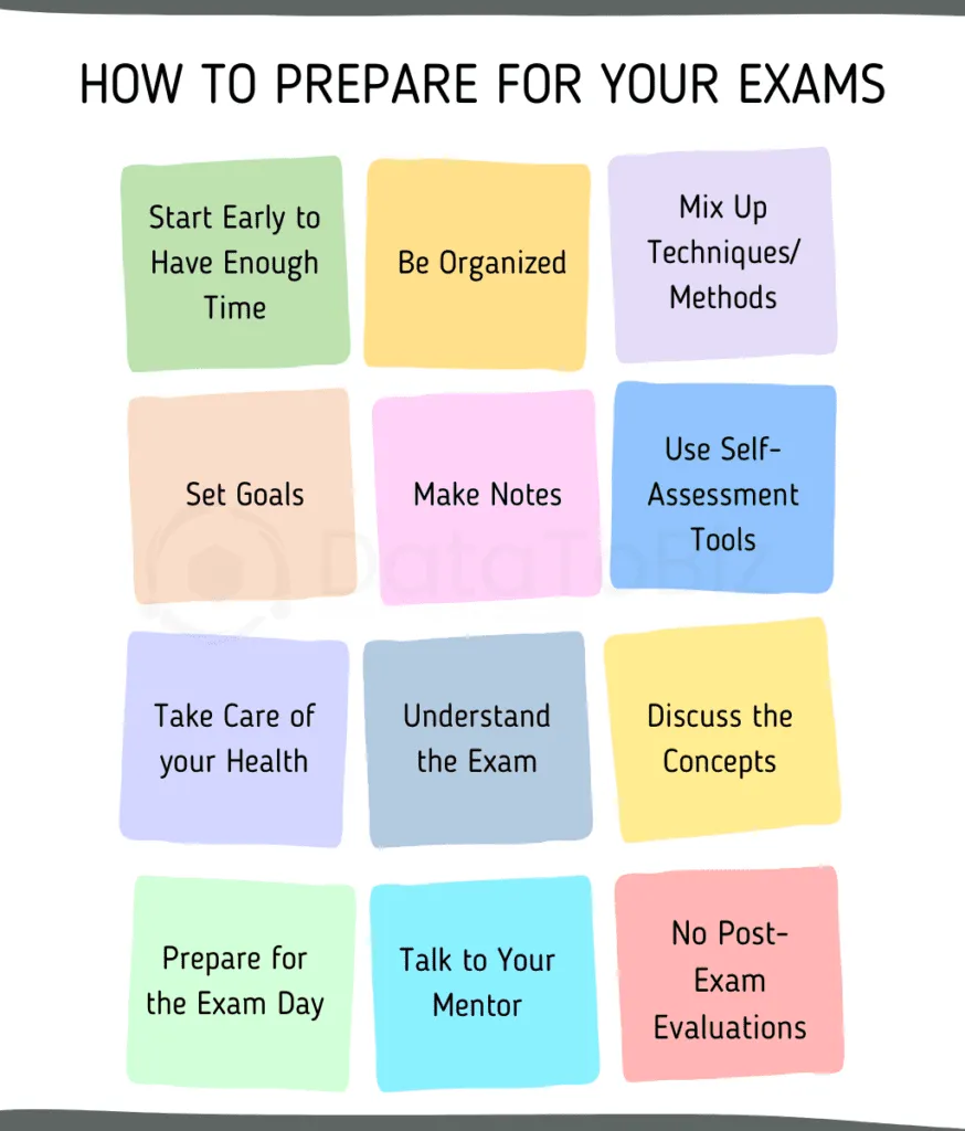 A day before the exam, the revision should be limited to reviewing the notes, testing oneself on the main concepts, setting the alarm, and revising tough topics.